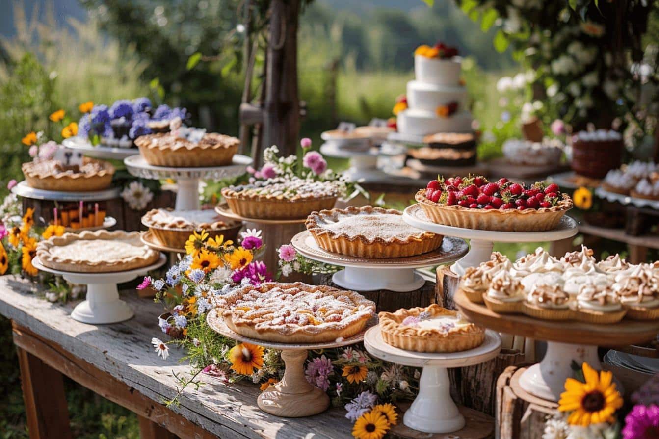 Lors d’un mariage champêtre, le choix des desserts peut transformer votre buffet dessert mariage champêtre en une expérience mémorable et gourmande. Parmi les incontournables, les tartes aux fruits frais se distinguent par leur simplicité et leur fraîcheur. Qu’il s’agisse de tartelettes aux fraises, aux abricots ou aux myrtilles, ces douceurs apportent une touche rustique et authentique à votre événement. Les meringues légères et croustillantes, agrémentées de crème et de fruits de saison, sont également des choix populaires qui séduisent par leur élégance et leur légèreté.