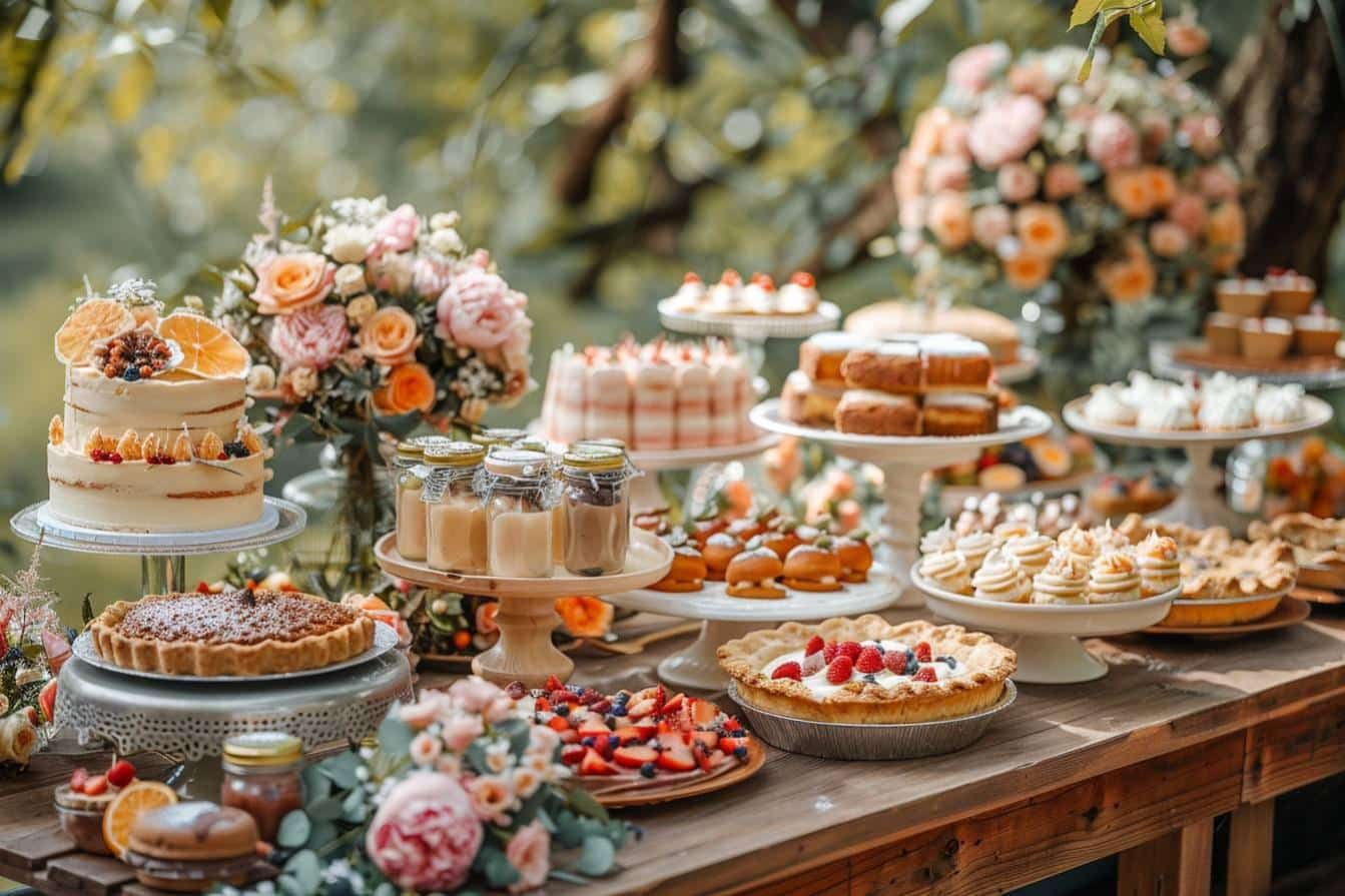 Un buffet dessert mariage champêtre original se distingue également par l’utilisation de produits artisanaux. Pensez à inclure des fromages locaux accompagnés de miel ou de confitures maison pour une touche sucrée-salée. Les produits laitiers tels que le yaourt fermier ou le lait cru peuvent servir de base à des desserts crémeux et authentiques. En plus de leur goût exquis, ces ingrédients apportent une dimension rustique et conviviale à votre buffet.