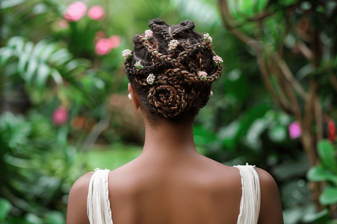 Pour une coiffure demi-queue mariage avec tresse, intégrez un ruban de satin ou une guirlande florale pour accentuer le style bohème chic. Ces accessoires doivent être choisis en fonction de la texture et de la longueur des cheveux, en veillant à ce qu’ils complètent la robe et le thème général du mariage. Les fleurs fraîches, telles que des gypsophiles ou des petites roses, peuvent également être tressées pour une allure naturelle et romantique.