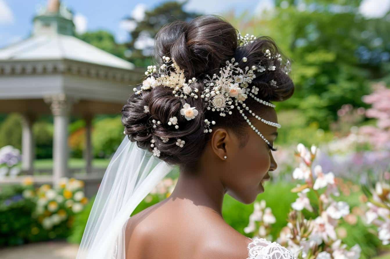 Pour celles qui souhaitent un look plus romantique, les fleurs fraîches ou artificielles sont des choix idéaux. Elles peuvent être intégrées dans une coiffure mariage cheveux attachés pour un effet bohème ou champêtre. Les couronnes de fleurs offrent également une alternative délicate et féminine, enveloppant la tête d’une aura naturelle. Si vous envisagez de porter un voile, il est essentiel de le coordonner avec des accessoires qui ne le surchargent pas. Les pinces discrètes ou les bandeaux subtils sont des options élégantes qui garantissent une harmonie parfaite.