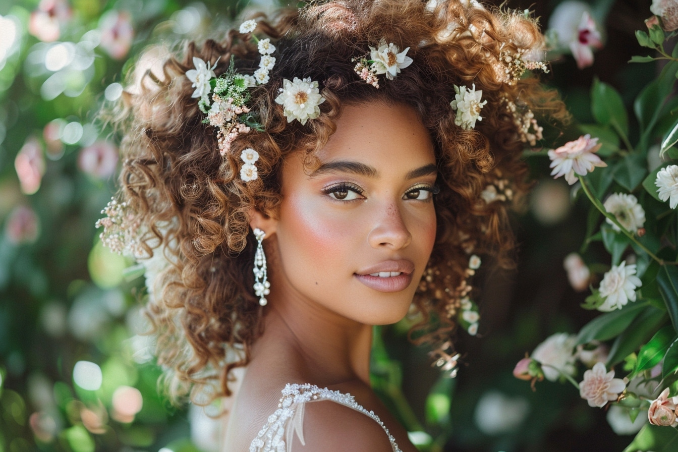 La diversité des idées coiffure mariage bouclé permet à chaque mariée de trouver le style qui lui correspond. Que vous ayez des cheveux naturellement frisés ou que vous souhaitiez créer des boucles pour l’occasion, il existe une multitude d’options pour personnaliser votre look. Certaines optent pour des coiffures mi-détachées, combinant la fluidité des cheveux lâchés avec la structure d’une demi-queue ou d’un chignon partiel. D’autres préfèrent laisser leurs cheveux totalement libres, mis en valeur par des accessoires délicats comme des couronnes de fleurs ou des barrettes scintillantes.