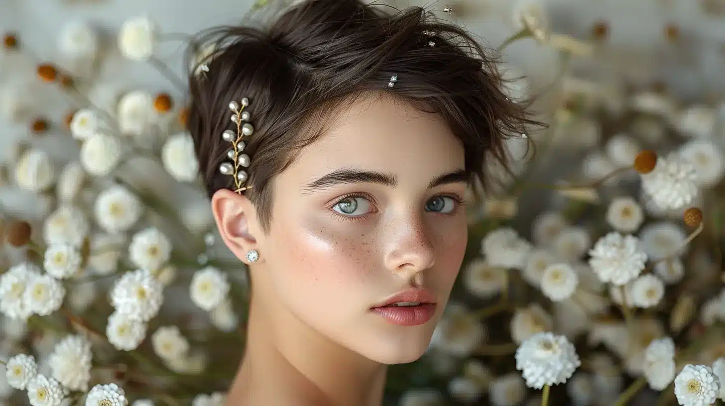 - Pixie cut avec des fleurs fraîches : Pour une touche bohème, rien ne vaut quelques fleurs délicatement placées dans un pixie cut. C’est la preuve que les accessoires cheveux mariage cheveux court peuvent transformer une coiffure quotidienne en quelque chose de vraiment spécial pour le grand jour.