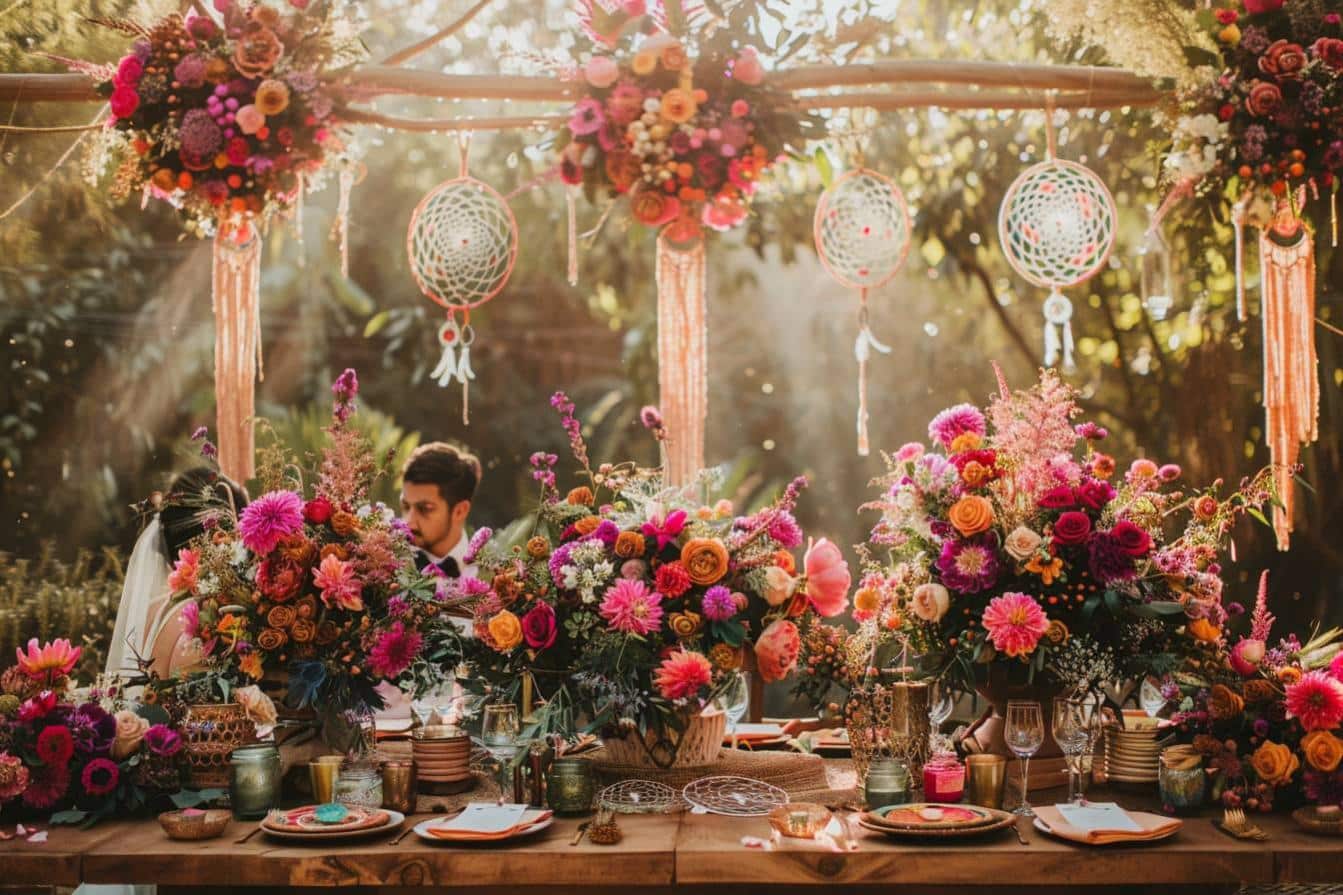 Pour sublimer votre decoration boheme mariage, n’oubliez pas d’ajouter des éléments décoratifs qui apporteront une touche personnelle et unique. Les suspensions en macramé, les guirlandes lumineuses et les bouquets de fleurs séchées sont des accessoires idéaux pour enrichir votre inspiration deco salle mariage boheme. Ces détails minutieux ne font pas que rehausser l’esthétique générale, ils racontent aussi une histoire et enveloppent vos invités dans une atmosphère bohème chic et inoubliable.