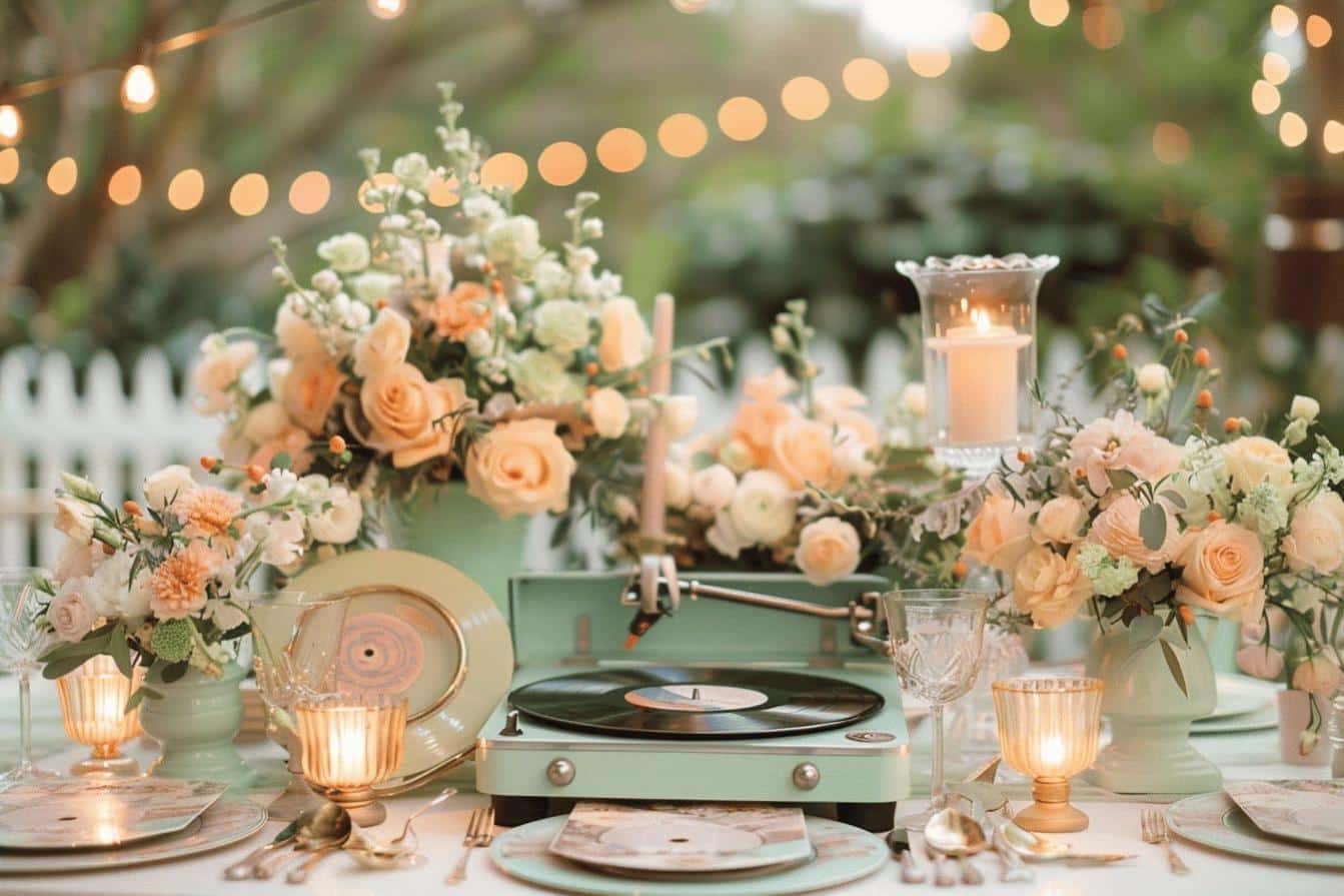 Pour plonger vos invités dans l’ambiance inoubliable des années 50, commencez par soigner la décoration mariage année 50 avec une attention particulière aux détails qui définissent cette époque. Optez pour des couleurs pastel comme le rose poudré, le bleu ciel et le vert menthe, qui étaient emblématiques de cette période. Agrémentez vos tables de déco mariage thème années 50 avec des nappes à pois ou à carreaux, et ajoutez des vases en verre laiteux remplis de fleurs fraîches comme les pivoines ou les marguerites. Ces éléments créent une atmosphère visuelle qui évoque instantanément le charme rétro.
