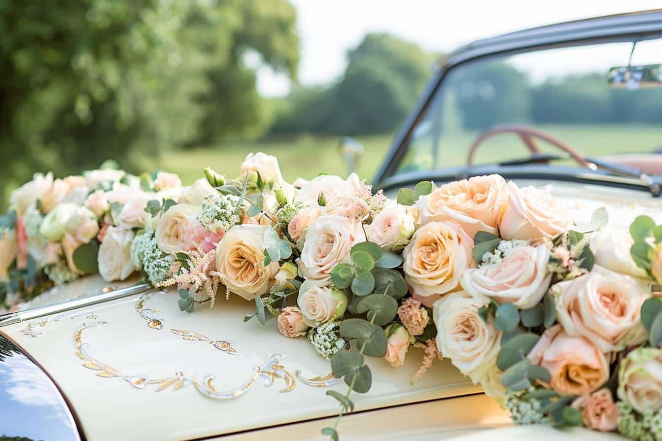 | Fleurs fraîches 🌸 | Guirlandes florales sur le capot ou le coffre | Privilégiez des fleurs résistantes aux températures |