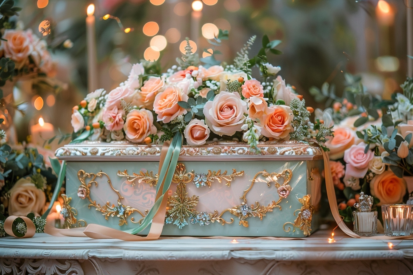 Ensuite, veillez à ce que l’urne s’accorde avec le thème général de votre mariage. Pour un mariage vintage, une urne en bois ou une vieille valise restaurée peut ajouter une touche charmante et nostalgique. Si vous préférez un style plus moderne, optez pour une urne aux lignes épurées et aux couleurs neutres. Personnalisez l’urne avec des éléments rappelant votre histoire d’amour, comme des photos, des initiales ou des citations significatives.
