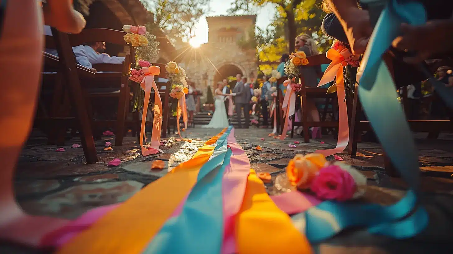 - Rubans de différentes couleurs : Prévoyez environ un ruban par invité participant. Les couleurs vives ajoutent une touche festive et joyeuse à l’animation mariage originale.
