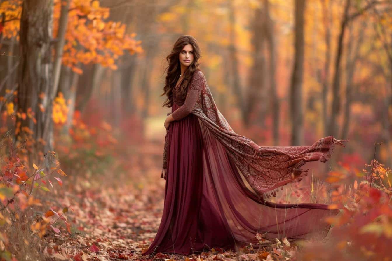 Avec l’arrivée de l’automne, les couleurs prennent une nouvelle dimension, et un mariage en octobre offre une palette exceptionnelle pour sublimer votre tenue. Les tons chauds comme le bordeaux, le terracotta et le vert forêt dominent, apportant une élégance naturelle et une chaleur réconfortante à vos choix vestimentaires. Ces nuances sont idéales pour une tenue mariage octobre femme, et s’accordent parfaitement avec les teintes dorées de la saison.