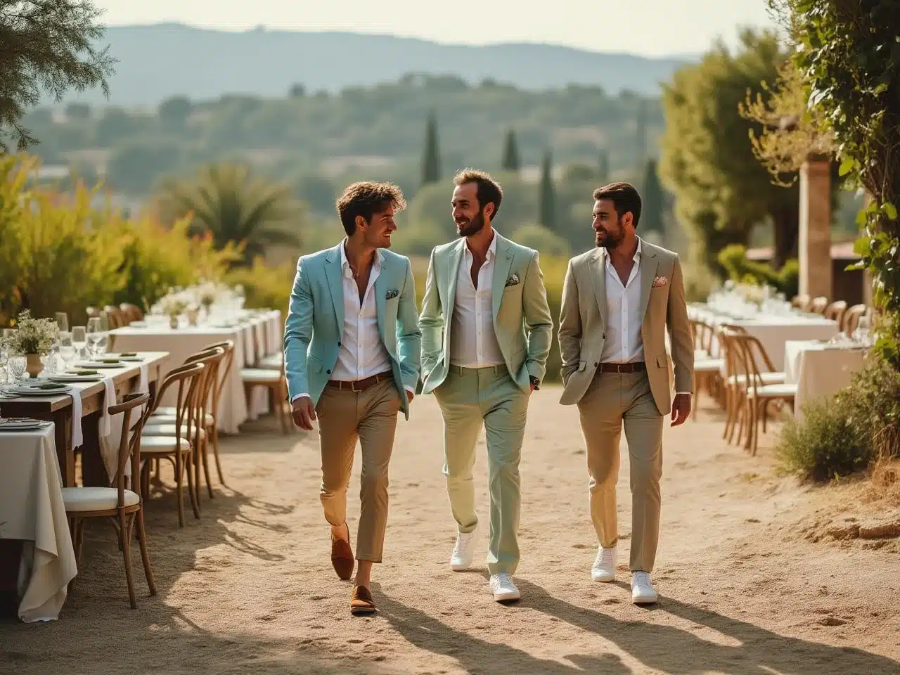 Le bleu clair domine les recherches « tenue mariage homme décontracté » et cela n’a rien d’un hasard : il renvoie immédiatement à la lumière du ciel et se marie avec la verdure d’un domaine champêtre. Pour rester frais, on l’adopte sur un blazer en lin non doublé, associé à une chemise blanche col officier et un pantalon écru. Même logique pour le vert sauge, teinte pastel plébiscitée par les wedding-planners pour son effet “nature chic”. L’option gagnante : un costume dépareillé veste sauge, chino sable, mocassins marron clair. Le contraste reste doux et parfaitement photogénique sous la tonnelle ou entre les rangées de vignes.